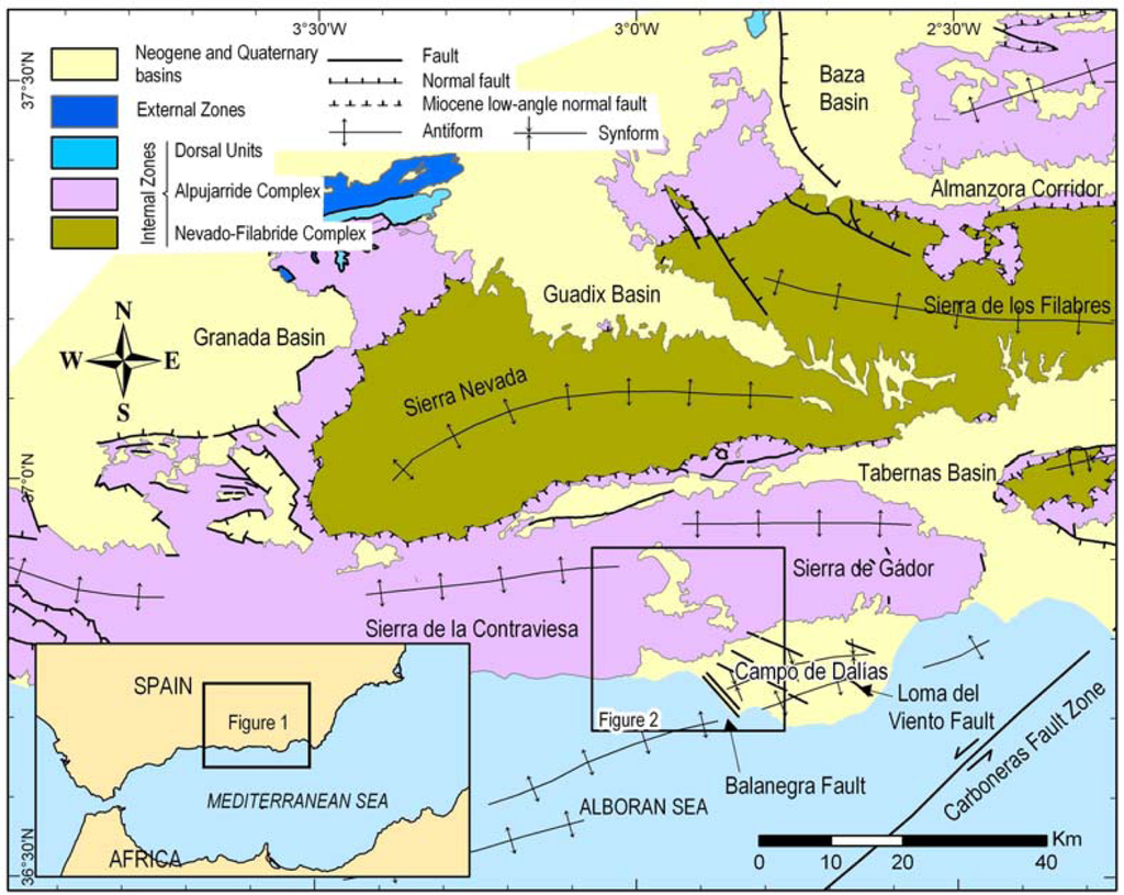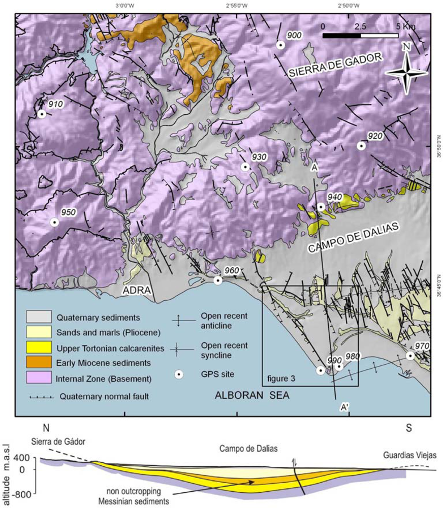 The Campo de Dalias and surrounding areas (Figures 1 and 2) comprise one of the most interesting zones for a characterization of present deformation as well as the relationship between the different compressive and extensional structures, folds and faults. The aim of this contribution is to describe the geologic, geomorphologic and seismic features related with recent tectonic activity, and to present data from the non-permanent GPS network and the high precision levelling profiles installed in this region. Horizontal NNW-SSE shortening through plate convergence and NE-SW coeval extension could thereby be determined, and the vertical uplift or subsidence related with development of folds and faults might be elucidated as well.