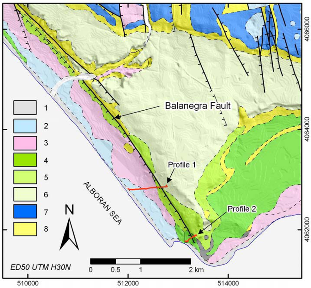 Detailed geological map of the southern end of Balanegra Faults including levelling profile location. 1: beach deposits (Holocene), 2: fluvial deposits (Holocene), 3: dunes (Holocene), 4: marine terrace (late Pleistocene), 5: marine terrace (middle Pleistocene), 6: marine terrace (early Pleistocene), 7: distal alluvial fans (Quaternary), 8: sands and silts (Pliocene).