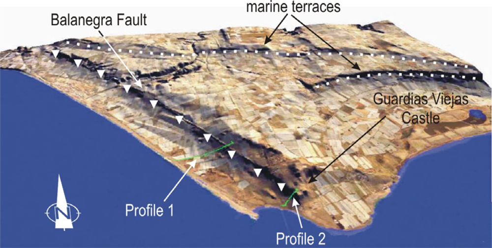 The study of low rate deformation tectonic structures is of great relevance, because although they are related with high seismic risk, it is difficult to accurately determine the deformation rates. With most active tectonic studies focused on faults, the analysis of related fold development is poorly documented. The southeastern region of the Betic Cordillera (Figure 1), constituting one of the most seismically active areas within the Iberian Peninsula, is a prime target for such analysis. The current NNW-SSE convergence between the African and Eurasian plates mainly develops compressive structures such as large folds and strike-slip faults. Many NNW-SSE normal faults are coeval with compressive structures.