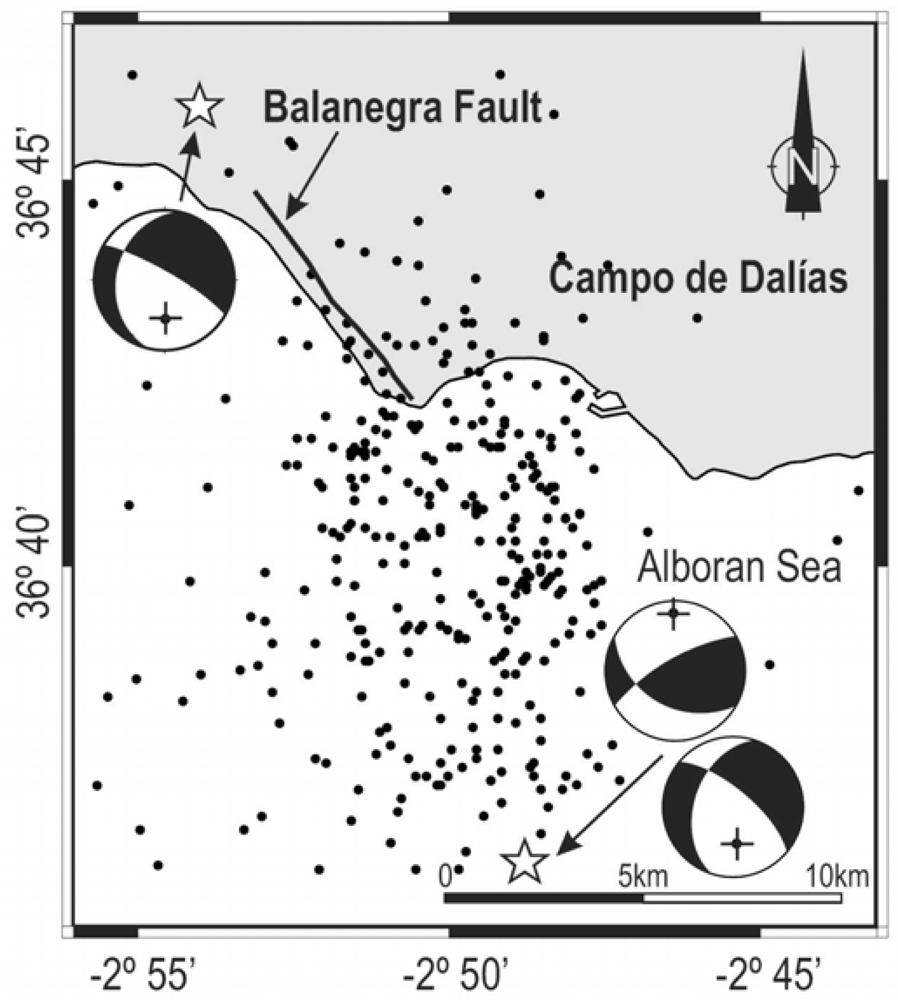 Epicentres and focal mechanisms near the Balanegra Fault.