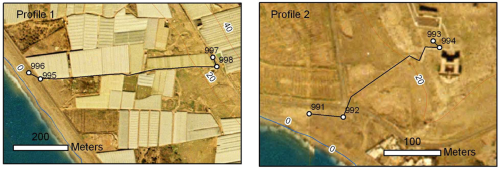 This study shows the results obtained for two levelling profiles across the Balanegra Fault (Almeria, Spain) in two field campaigns, in 2006 and 2007 (Figure 3). The Greenhouses Profile (Profile 1, Figure 3) is 800 metres long and stretches from 997 to 996 benchmarks, whereas the Old Guards Fortress Profile (Profile 2, Figure 3) has a length of 350 metres and runs from 993 to 991 benchmarks (Figure 6). All benchmarks were embedded vertically on rocks to guarantee their stability.