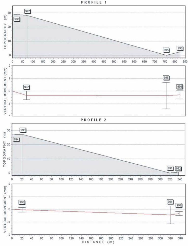Two recent vertical movement profiles were constructed by comparing the benchmark height differences measured in the 2006 and 2007 campaigns by using the raw height differences between consecutive benchmarks obtained from the forward and the backward levelling data (Figure 7). In these profiles, the error bars are equal to two standard deviations with respect to the previous benchmark. As the error bars are larger than the vertical changes, the movements in this period are not significant in the two profiles.