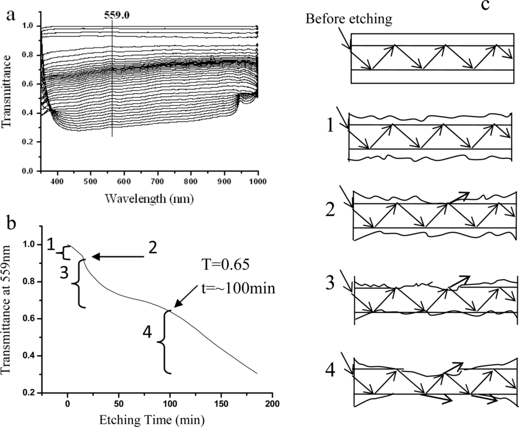 Figure 1b). The transmittance dropped gradually. The etching process can be divided into four stages (1–4 in