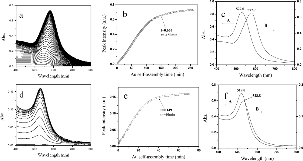 Figure 2b and e show the trends of the LSPR peak intensities as a function of the Au NPs assembly time. At the beginning, the adsorbing process was fast, because there were a great number of active spots on the PE trilayer for the adsorption of Au NPs. Then the peak intensities increasd slowly. There might be two reasons to explain this phenomenon: one is the reducing of active spots on the trilayer PE matrix, and the other is that the interparticle electrostatic repulsion arose from more and more Au NPs. For the 48-nm Au colloid, when the assembly time is about 150 min, its peak intensity is 0.655 and the peak position is 577.7 nm. For the 23-nm Au colloid, the peak intensity is 0.149 and the peak position is 528.8 nm when the assembly time is about 39 min. It indicates that the size of Au NPs could influence the assembly time. The peak positions of the Au NP assembled films had 50.7 nm (for the 48-nm Au NPs) and 9.8 nm (for the 23-nm Au NPs) red shifts relative to their original Au colloids, respectively (