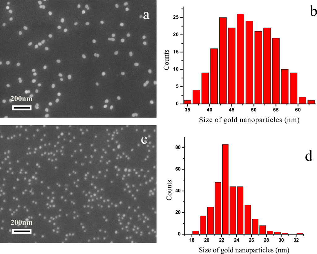 Figure 3a and c show the SEM images of the Au NP films prepared by different sized Au NPs. The assembled Au NPs are spherical in morphology, with the size of 48 ± 6 nm and 23 ± 2 nm. The distribution of the Au NPs on the assembled film is uniform. No aggregates of Au NPs can be seen. The coverage fraction of colloid A and B in the film is 6.934% ± 1.625 and 5.686% ± 0.946, for 48-nm and 23-nm Au, respectively.