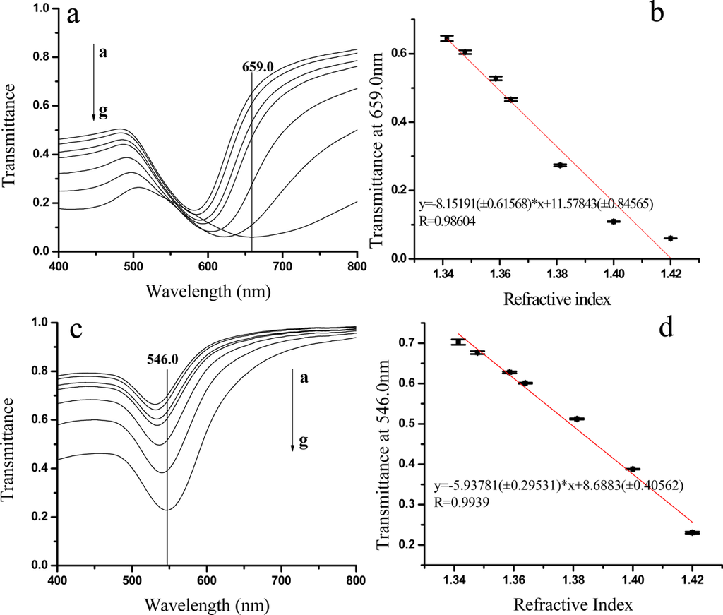 Figure 4a,c present a series of transmission spectra of the LSPR sensors incubated with different concentrations of sucrose solutions. It can be seen that the red shift of the LSPR band positions took place and the transmission peak intensities reduced gradually with the concentrations of sucrose solutions increasing. The transmittance at 659.0 and 546.3 nm was chosen to plot the LSPR response to the refractive index of sucrose solutions (