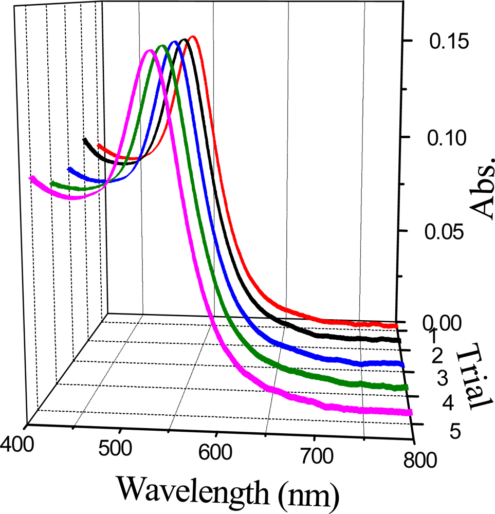 Figure 5 shows the five absorption spectra of a 23-nm Au optical fiber LSPR sensor in water. Hardly any difference of these absorption curves can be seen. The standard deviation of LSPR peak intensity is only 0.02%. This illustrates that the sensor prepared by the assembly method is controllable and reproducible.