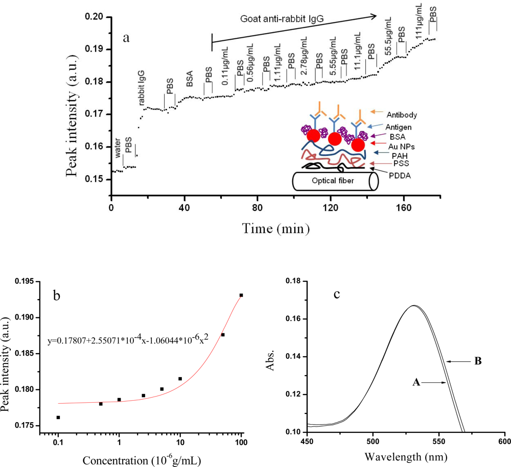 Figure 6a). Different concentrations of goat anti-rabbit IgG (in PBS solution) were pumped into a liquid cell. The 23-nm Au assembled optical fiber LSPR sensor was used here due to its shorter preparing time (