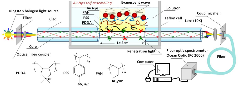 2]. Environmental changes at the interfaces between media and metals can be traced by the changes of metal LSPR characteristics. The coupling of LSPR sensors and optical fibers bring several advantages. First, multiplying the total reflection of light transmission in the optical fiber excites a sample many times, so the detection sensitivity of analytes is expected to be improved. Secondly, the penetration depth of evanescent field on the sidewall of unclad optical fiber is only 100–200 nm [