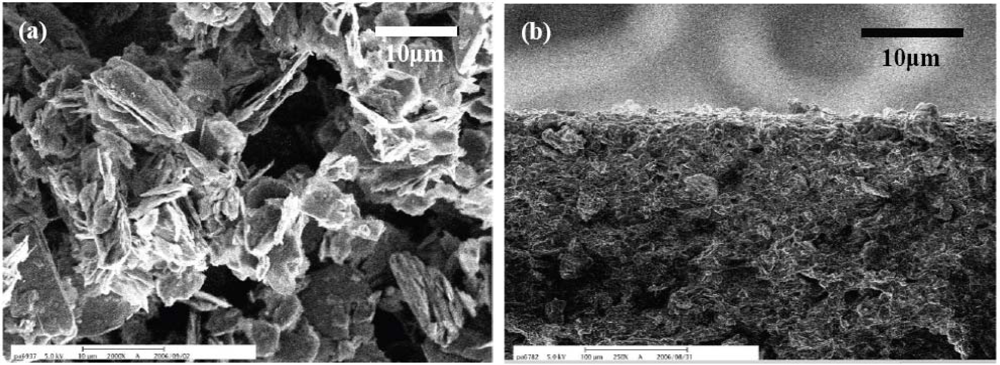 In order to make the insulation matrix conductive, we interfused conductive fillers such as carbon black (Ketjen Black EC300J), graphite powder (Sigma-Aldrich No.15553), carbon nano-fibers (Showa Denko VGCF®-H) into PDMS. The temperature sensitivity of the composites based on these three different conductive fillers was evaluated separately. The image taken with a scanning electron microscope (SEM) in Figure 1(a) indicates that the mean diameter of the graphite powder is about 10 μm and that the shape is irregular. It is worth mentioning that the electrical conductivity of polymer-graphite composites would increase with mean diameter of the graphite [25]. The cross-sectional SEM image of a graphite-PDMS composite is shown in Figure 1(b).