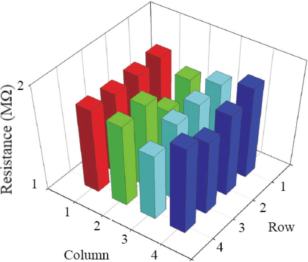 The fabricated temperature sensor array of 20% volume fraction of graphite powder was connected to the scanning circuits for full-function evaluation. At room temperature, the resistance varies randomly between 1.43 MΩ and 1.76 MΩ across the sensor array. For easy observation, a 4 × 4 resistance map of the array is shown in Figure 10.