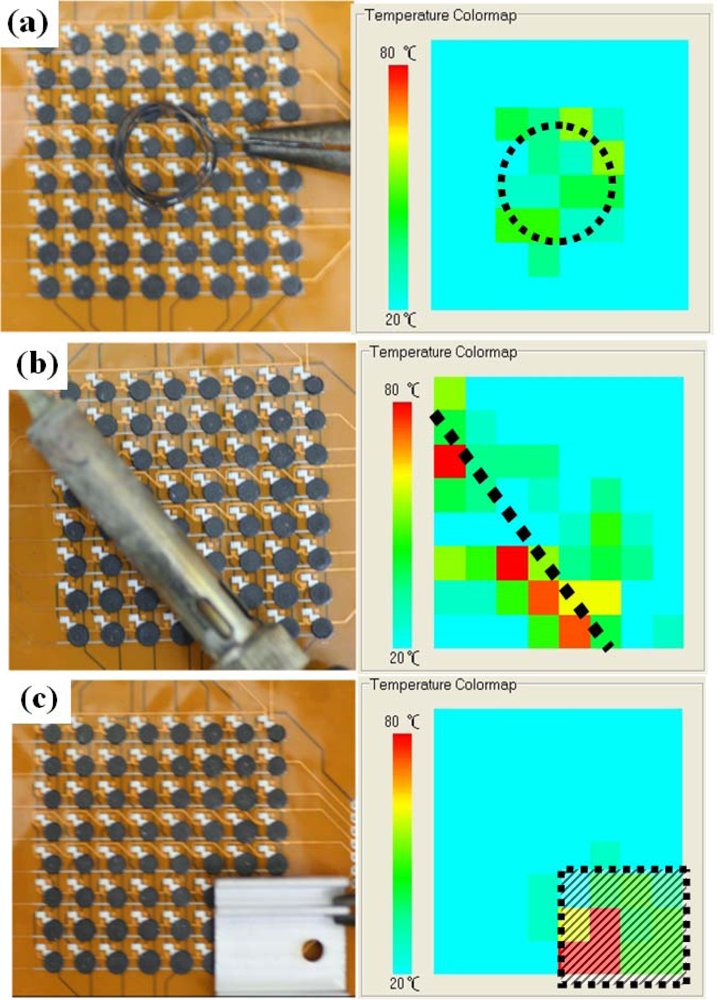 The resistance variation could be due to the thickness and shape non-uniformity since they were controlled by applying the thin plate for flattening all sensor cells. Nevertheless, measurement uniformity could be achieved by conducting independent calibration of each sensor cell. We also improved the performance uniformity of the sensor array by adjusting scanning circuit program. Then heat sources with different shapes were applied 5 mm above the temperature sensor array. The heated ring is made of iron wire. The heat rod is soldering iron. The heated plate is made of bulk aluminum. The temperature increase is successfully detected by each sensor cell, and the overall temperature is displayed by the contour map shown in Figure 11. These contours are in well agreement with the shapes and temperature scales of the applied heat sources. The non-uniform temperature distribution could be caused by the heat source, background noise, or ambient fluctuations.