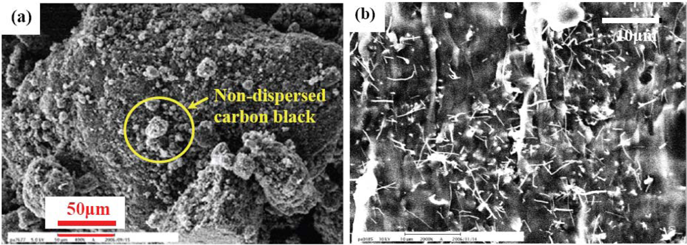 SEM images of (a) carbon black in PDMS and (b) carbon nano-fibers in PDMS.