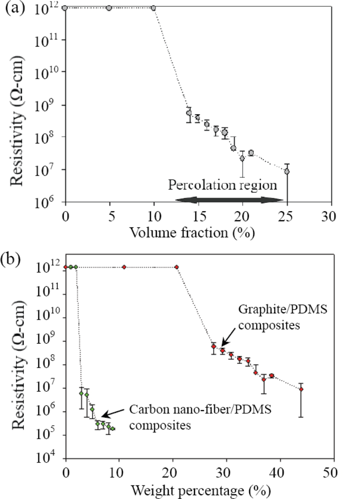 (a) Percolation threshold of graphite/PDMS composites. (b) Resistivity of graphite/PDMS and carbon nano-fiber/PDMS composites at different weight percentage of the conductive fillers.