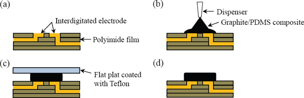 Process flow for fabricating the temperature sensor array. (a) Flexible printed circuit. (b) Applying graphite/PDMS composite on the interdigitated electrode. (c) Applying a flat plate coated with Teflon to flatten the composite. (d) Curing the composite and then removing the plate.