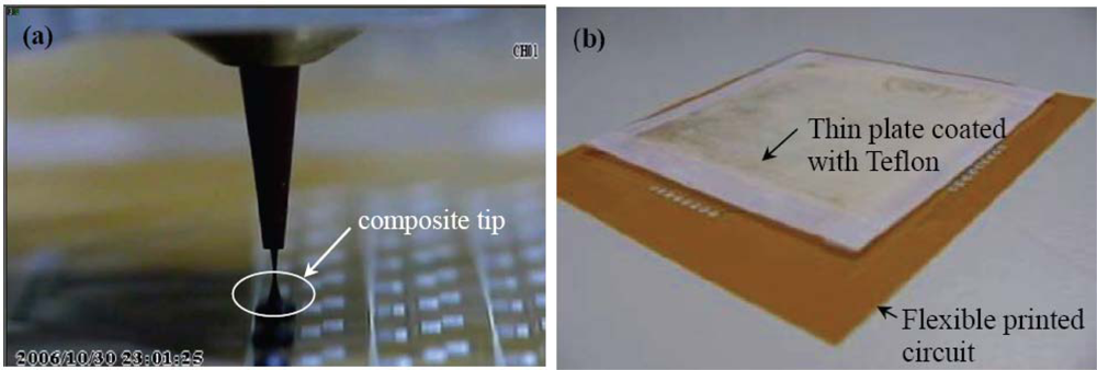 To fabricate the temperature sensor array, the graphite-PDMS composite must be prepared beforehand. The conductive filler, graphite powder, together with dispersant was blended into PDMS prepolymer at the first step. A dispersant such as cyclohexane increases the fluidity of the PDMS prepolymer and improves the mixture uniformity through the blending procedure. The blending procedure included ultrasonic mixing and stirring steps and was conducted for 30 minutes. Then the PDMS curing agent was well mixed into the composite. We degassed all the mixture in a vacuum chamber for 30 minutes to evaporate the volatile cyclohexane. In this step, we did not observe any migration of the graphite caused by the gravity. The process for applying the unpolymerized sensing material onto the flexible printed circuit is depicted in Figure 4. The composite was put into a dispensing machine to be selectively applied on the designated interdigitated copper electrodes, as shown in Figure 4(b). This automatic dispensing system is an SR-300D from Homytech Auto Part Co., Taiwan. It has a minimum motion step of 50 μm and is therefore capable of addressing high-resolution sensor arrays. By controlling the three-axis movement platform of the dispensing system, the graphite-PDMS composite can be well aligned with the pattern of the sensing electrodes. The transferring and dispensing steps took less than 10 minutes. Due to the high viscosity of the mixture, the uniformity of the volume fraction could not be affected. There are 64 sensing electrodes distributed over a 4 × 4 cm2 area, and the dimension of each interdigitated electrode is 1.5 × 1.5 mm2. Hence the volume of the graphite-PDMS composite on each sensing electrode could constantly be kept small.