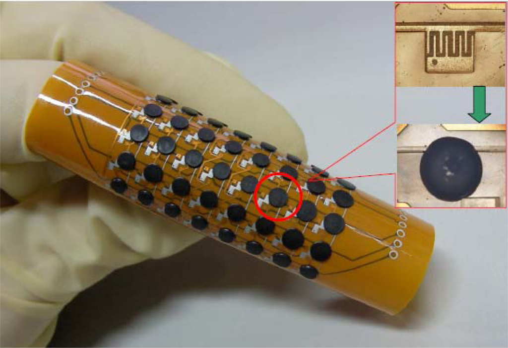 The graphite-PDMS composite becomes more viscous as the volume fraction of the graphite powder increases. The volume fraction of the conductive fillers must be robust for adequate electrical resistance and manufacture feasibility. The graphite-PDMS is dispensed at room temperature to avoid the dispenser from clogging up over time. The PDMS curing time at room temperature is much longer than the time, which is about ten minutes, for dispensing the composite on 64 electrodes [28]. To overcome the high viscosity of the graphite-PDMS composite, a constant pressure of 294 kPa is applied to dispense the composite. When the automatic dispensing system moves up and down, it will cause sharp tips of residue PDMS as shown in Figure 4 (c) and Figure 5 (a). The composite sticks to the copper and the substrate very well without any modifications on the polyimide surface. These sharp tips will cause non-uniform contact between heat source and every single sensor cells, resulting in inaccurate temperature contour of the sensor array in practical implementation. To eliminate these sharp tips, we pressed the sensor array with a thin flat plate, on which the surface energy has been reduced by Teflon coating, as shown in Figure 4(c) and Figure 5(b). Then we put the sensor array on a hotplate and cured the PDMS at 80 °C for 8 hours to completely evaporate the cyclohexane solvent. Finally, we removed the flat plate, as shown in Figure 4(d). The fabricated temperature sensor array exhibits good flexibility, as shown in Figure 6. The insets show the sensing electrode and an electrode covered with the composite, respectively.