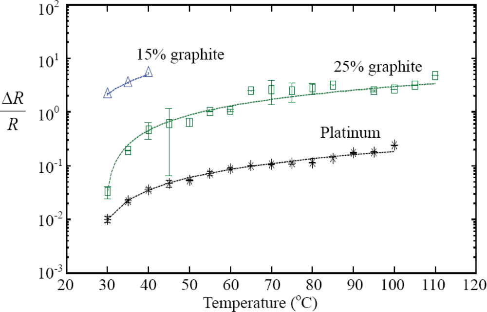 PDMS with three different volume fractions of graphite powder (15% and 25%) were chosen to determine the resistance variations by altering temperature on a hotplate in an air atmosphere. These volume fractions were chosen for higher temperature sensitivity as they are in the range of the percolation threshold. After degassing and curing, the sheets of the graphite-PDMS composites were cut into 1 × 1 cm2 pieces and then sandwiched by copper plates. The thickness of these PDMS sheets was fixed at 0.5 mm by using a scraper before polymerization. The copper plates were connected to a multimeter for resistance measurement while the temperature on the composite sheets was increased from 25 °C to 110 °C on the hotplate. Before each measurement, the temperature was increased by 5 °C and then maintained as a constant for 10 minutes to assure thermal equilibrium between testing sample and hotplate. The relative humidity of the testing environment was maintained at 60%. Figure 7 shows the measured resistance variation of the graphite-PDMS composites subjected to different temperature. Platinum thin film as a temperature sensor was also characterized for comparison. The temperature coefficient of resistance (TCR) can be calculated by: