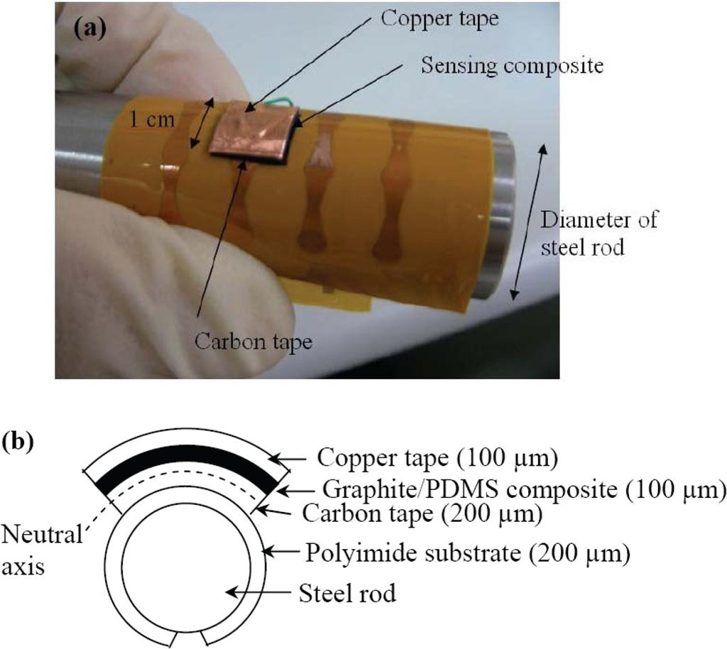 The sensing composite in 1 cm2 area was sandwiched between a conductive copper tape and a conductive carbon tape on a flexible printed circuit board. Its resistance was then measured on steel rods of different diameters. (a) Photograph of the bending test. (b) Side-view illustration.