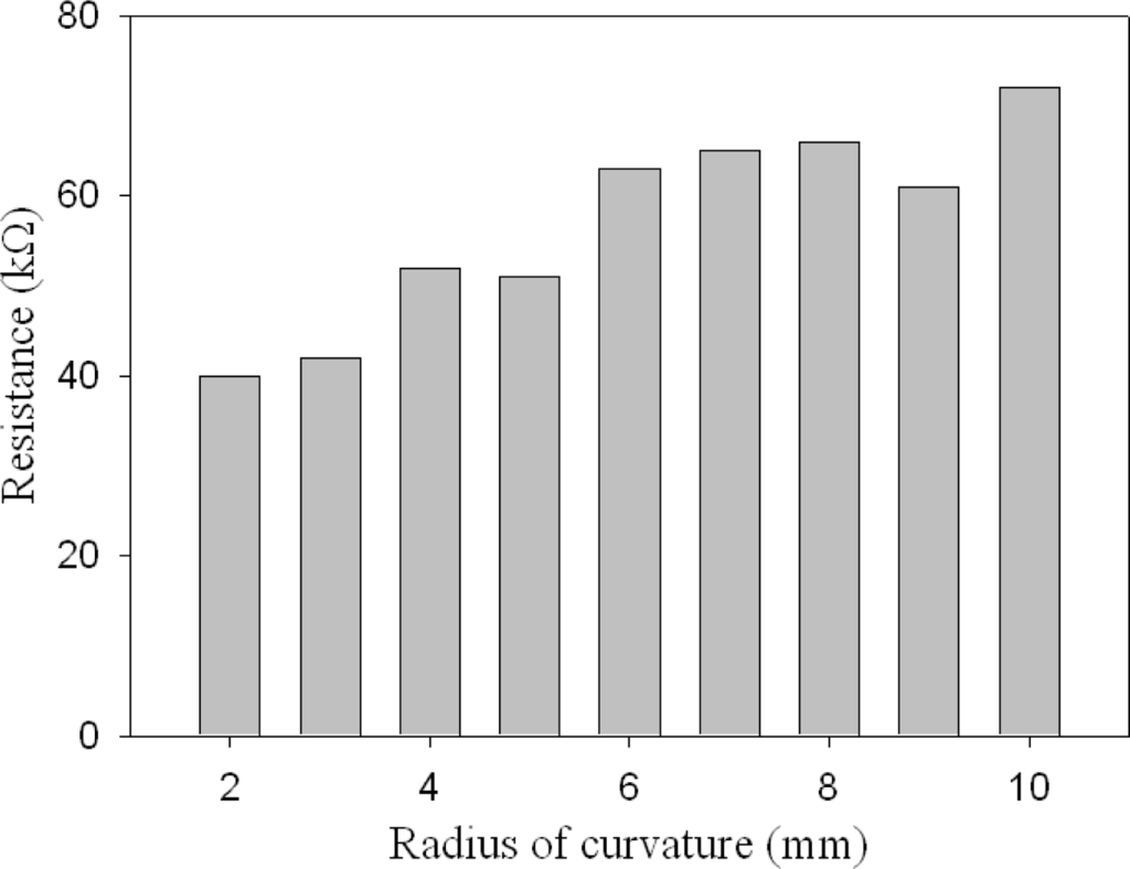 The configuration in Figure 8(b) is to shift the material away from the neutral axis so that the material can be completely under tensile stress. The sensing composite was then wrapped around steel rods, and its resistance change was measured. The steel rods have different curvature radii from 2 mm to 10 mm with 1 mm increment. The testing results in Figure 9 indicate that the resistance decreases with the radius of curvature. This is because the composite was put at the convex side in the test and hence was subjected to tensile stress. The tensile stress stretches the composite laterally, causing the thickness to decrease. Thinner composite has smaller resistance. This bending test implies that the sensing signal of the composite could be affected by external stress. To remove the bending effect, one can simply put the composite close to the neutral axis by change the thickness ratio of the material to the substrate.