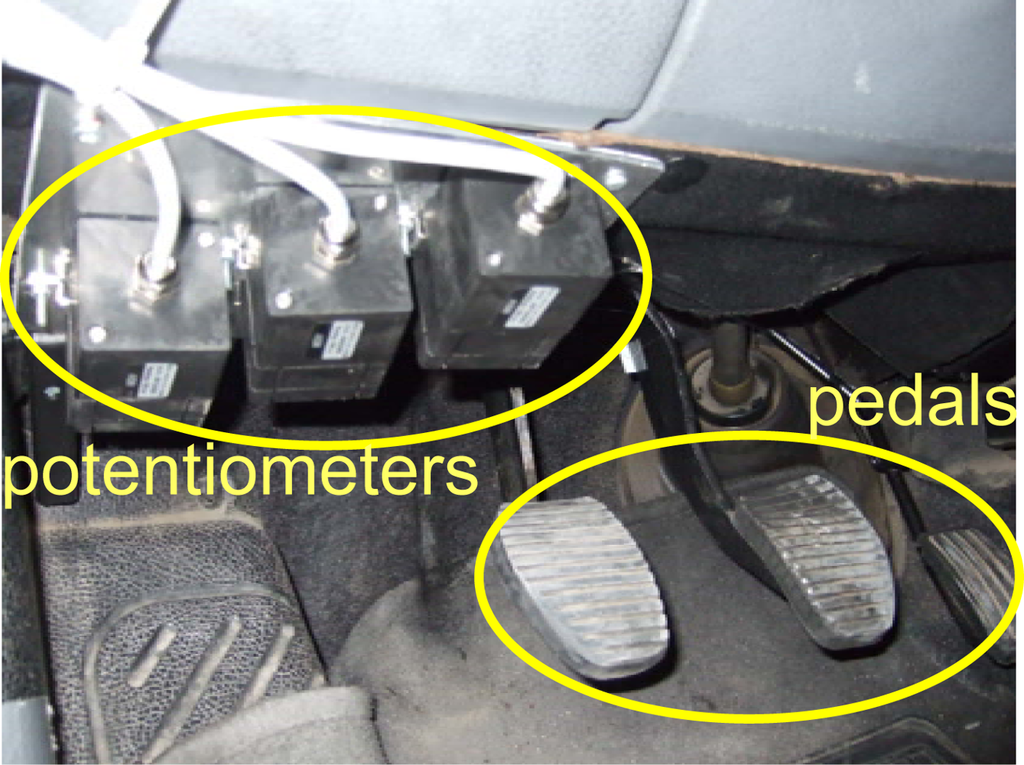 The instantaneous and simultaneous measurement of the three car pedals is a difficult task in the great majority of vehicles. In fact, there are 3 methods to directly measure the status of the car pedals: using position sensors [], using pressure sensors [–] and through the electronics system provided by the vehicle manufacturer (e.g., SMART and RAVEL-I [,]).