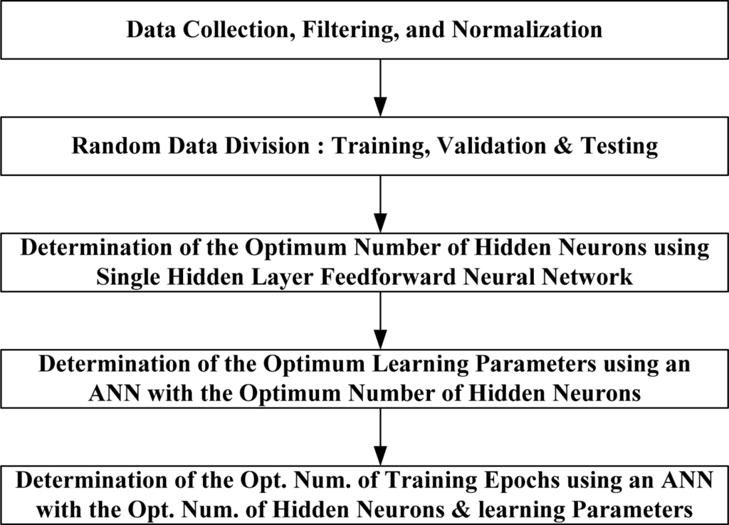 Concerning the second possibility, there is no theory yet to explain how many hidden neurons are needed to approximate any given function. If there are too few hidden neurons, a high training error and high generalization error would result due to underfitting and high statistical bias. On the other hand, if there are too many hidden neurons, there would be a low training error, but there would still be a high generalization error, due to overfitting and high variance. In most situations, there is no way to determine the best number of hidden neurons without training several networks and estimating the generalization error of each [,,,]. In this paper, the network growing technique [] is applied by adding hidden neurons sequentially from 1 to 20 and comparing the generalization (testing) RMSE error, calculated by Equation (2), between the measured outputs and the model estimated ones. Where O is the vector of observed (measured) values, P is the vector of model-estimated values, and N is the number of samples in the testing subset. The proposed criterion in this paper is that the optimum number of hidden neurons equals that number after which the testing RMSE stops to decrease: