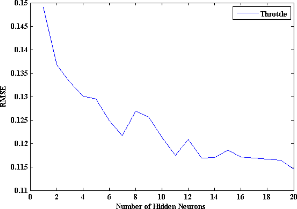 RMSE vs number of hidden neurons of the throttle pedal ANN model.