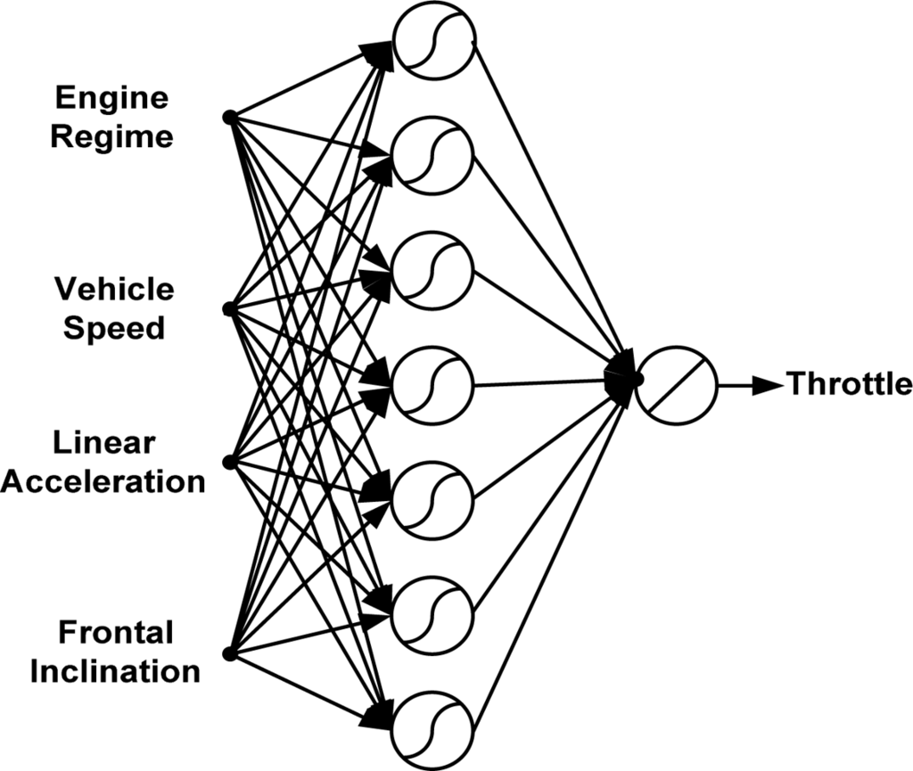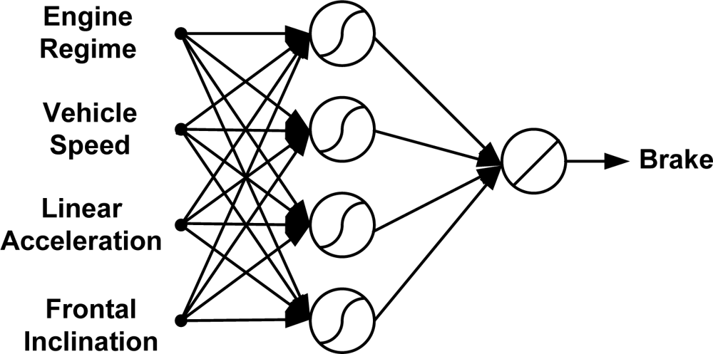 Artificial neural networks (ANNs) are one of the most powerful tools that have been widely employed in recent years in various fields such as sensors [–], measurement and control [], and engineering [] due to their computational speed, ability to handle complex non-linear functions, robustness, and great efficiency even in cases where full information for the studied problems is absent. Function approximation is one of the basic learning tasks that an artificial neural network can accomplish. The ability of a neural network to approximate an unknown input-output mapping may be exploited in one of two ways, system identification or inverse modelling [,]. This paper exploits the inverse modelling capability of neural networks by estimating the pedals activity (PA) in terms of easily measurable driving variables (MV) like regime engine (RE), vehicle speed (VS), frontal inclination (FI), and linear acceleration (LA). These measurable driving signals change as a result of the driver activity on the vehicle pedals. What the authors are presenting in this paper is a proposal to deduce the pedals activity from the previously mentioned driving signals. In other words, an inverse neural network model is described in this work to estimate the vehicle pedals activity as a way to deduce driving dynamics.