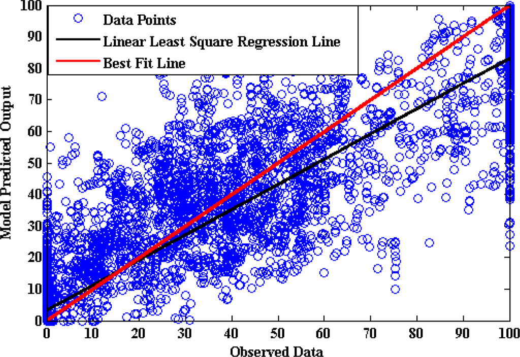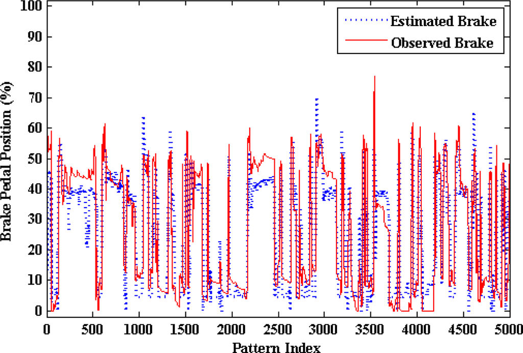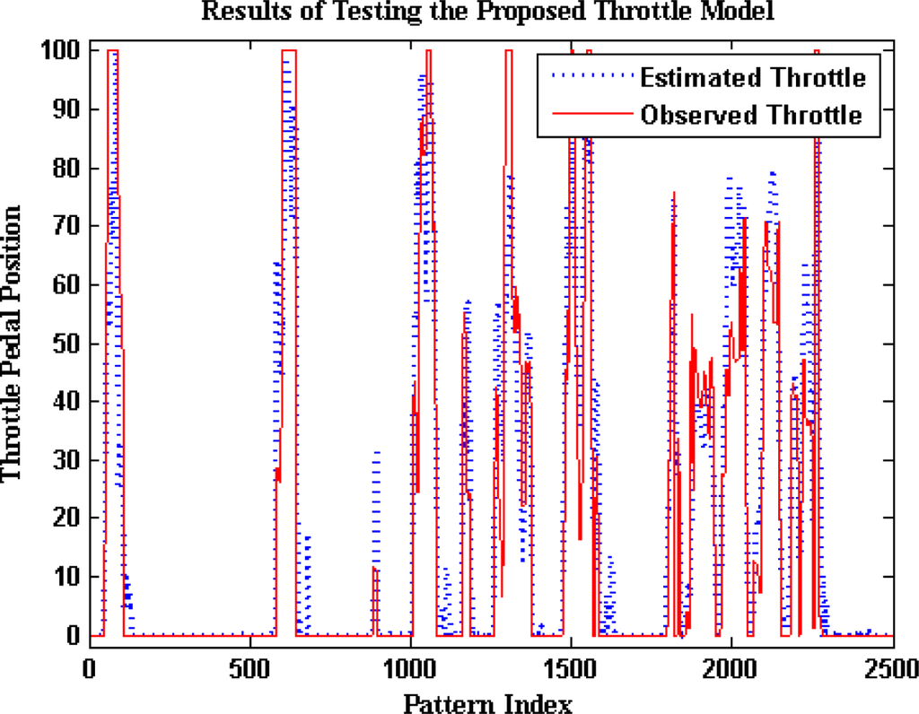 Moreover linear regression analysis is done between the model-estimated data and the captured data as shown in Figure 14, where the model estimations are plotted against the observations. It shows that the proposed model underestimates the throttle pedal activity when the captured values are towards the higher side and overestimate when the captured values are towards the lower side. The regression coefficient is 0.9008, a (slope) = 0.8811, b (intercept) = 3.0952.