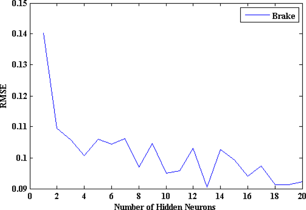RMSE vs. number of hidden neurons for the brake ANN model.