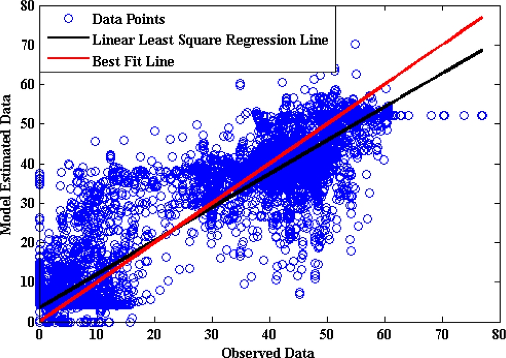 Moreover a linear regression analysis was done between the model-estimated values and the real values. A model that exactly reproduces the actual observations has slope ‘a’ as 1 and intercept ‘b’ as 0. The parameters ‘a’ and ‘b’ are calculated following the least square procedure as given in Equation (3):