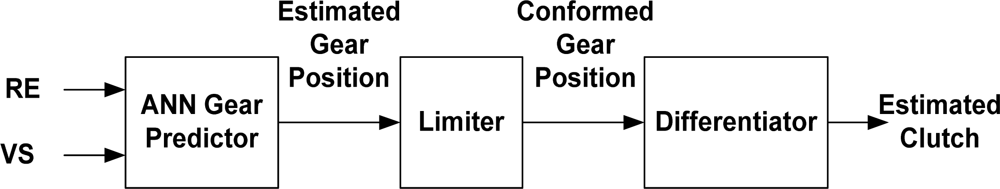 An alternative approach is to use the regime engine (rpm) and vehicle speed (km/h) signals to deduce the gear position signal (discrete amplitude signal), as described in []. Starting from the gear position signal, the clutch activity signal can be estimated easily by detecting the instants corresponding to a gear change event. The process of predicting the gear position based on the corresponding regime engine (RE) and the vehicle speed (VS) can be achieved using ANNs. However the task of detecting the gear change events can be accomplished by a differentiator once the estimated signal is conformed. Figure 19 illustrates a block diagram of this alternative system used to model the clutch pedal activity.