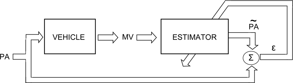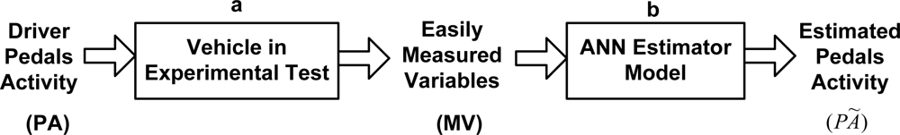 The main idea of this work is to develop a mathematical model to estimate the pedals activity (PÃ) of any driver on the pedals of any unit of the same vehicle model using real experimental tests with particular vehicle model and several drivers. Thus, instead of directly using sensors associated with driving pedals to provide the (PA) information, the authors introduce in this paper a sensor system that includes alternative devices easier to implement and provide (MV) information of driving dynamics. Figure 2 shows these two processes for the driving pedals activity estimation followed in this work.