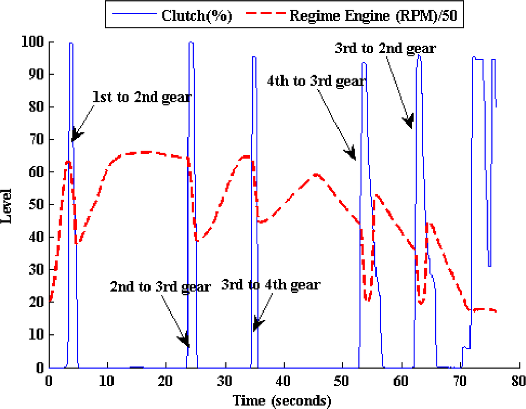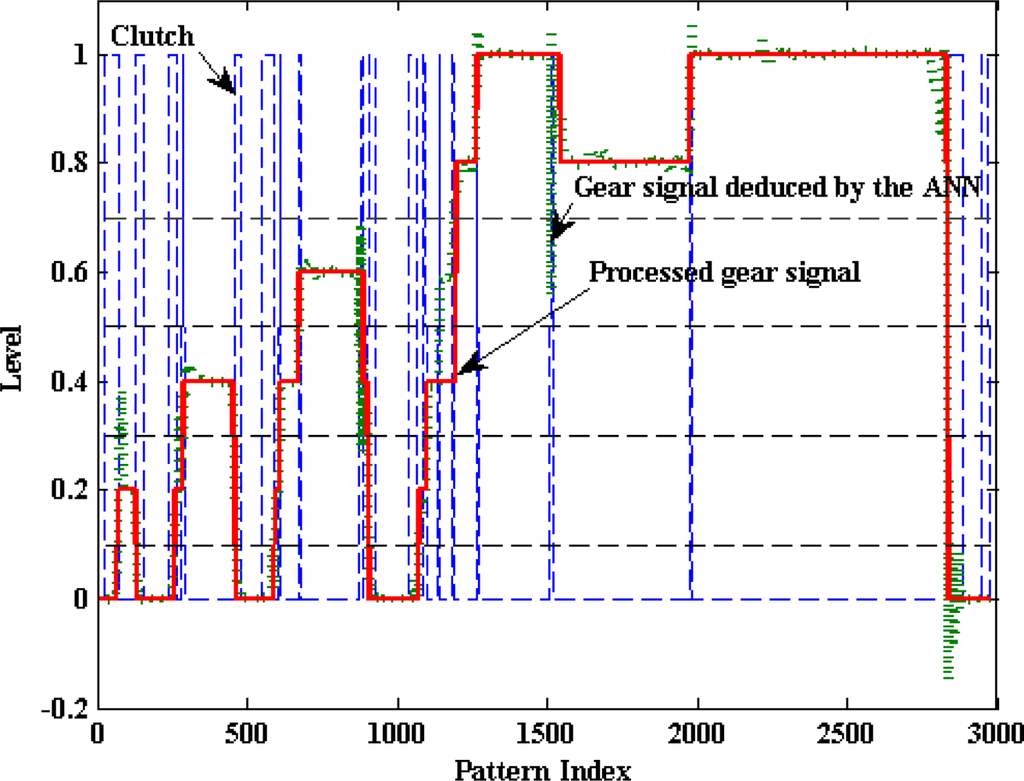 Figure 20 illustrates the results of the described proposal based on data from a European Cycle Test of the Peugeot 406. The blue dashed line represents the clutch activity captured by the corresponding potentiometer. The dotted green line represents the estimated gear position signal and the solid red line represents the conformed one. As it can be appreciated, the ANN models the gear position based on the regime engine and vehicle speed with a great efficiency. Moreover, it’s straightforward that the clutch activity signal can be efficiently deduced from the gear position signal as it is shown in Figure 20.