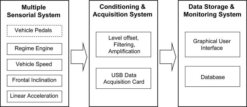 The second subsystem (Figure 3) is in charge of the conditioning and acquisition of signals from sensors []. Finally the third subsystem is responsible for monitoring and recording the data for further offline processing. A sampling period of 20 ms, which is sufficient to represent the dynamics of the driver’s action, was chosen to capture any quick action of the driver on any of the pedals.