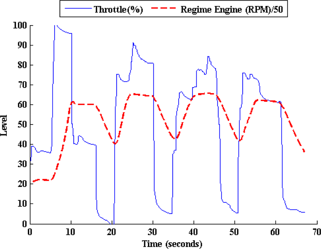 In Figures 4–8, experimental results obtained from a Peugeot 406 tested in both a chassis dynamometer and in an urban circuit are shown. These figures confirm the relation between the MV and the PA variables of the model to be designed. Figure 4 shows the regime engine (RE) derived from the clutch pedal. It can be appreciated that there is a clear relationship between both of these variables; one of them is activated by the driver and the other one shows the vehicle’s answer.