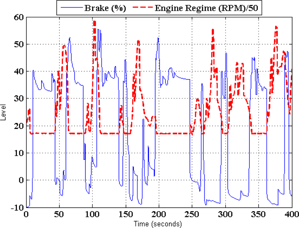 Figure 5 illustrates the RE deduced from the throttle pedal activity results of another laboratory experiment using the same vehicle running at second gear. As it can be seen, the regime engine increases when the throttle is pressed, however it decreases when the throttle is released (brake action is not allowed on chassis dynamometer). Figure 6 shows the results of an experiment in an urban circuit in Madrid City using the previously mentioned vehicle. It’s noted that when the foot is put on the brake pedal, the regime engine starts to decrease. As can be observed, there is a clear difference between the behaviors of the clutch, i.e., on/off, and that of the throttle and brake pedals, i.e., the continuous variation between two limited values of these two pedals.