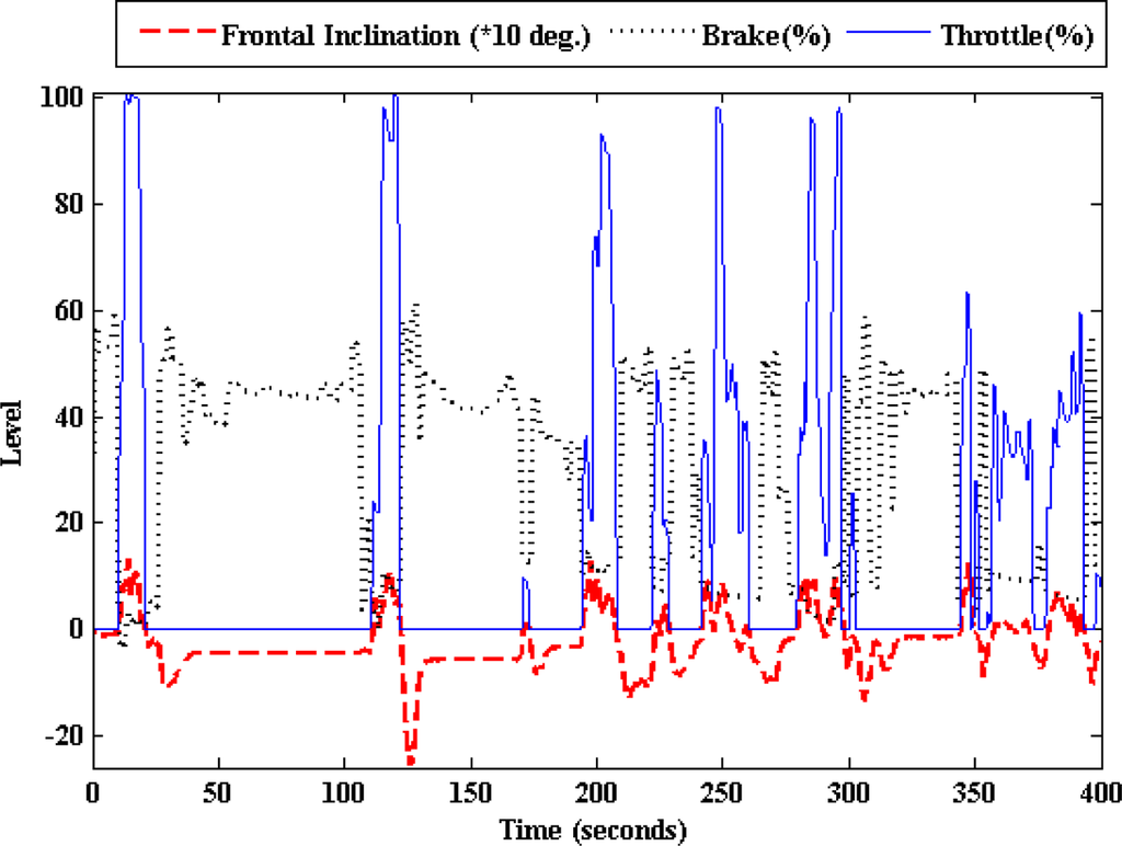 Figures 7 and 8 show how the frontal inclination and linear acceleration signals of the inertial sensor vary with the throttle and brake pedals activity. In other words, the car’s chassis moves upwards and the linear acceleration increases when the throttle is pressed. On the contrary when the brake is pressed, the car’s chassis moves downwards and the linear acceleration decreases. The experimental data was obtained from the previously mentioned urban circuit using the Peugeot 406.