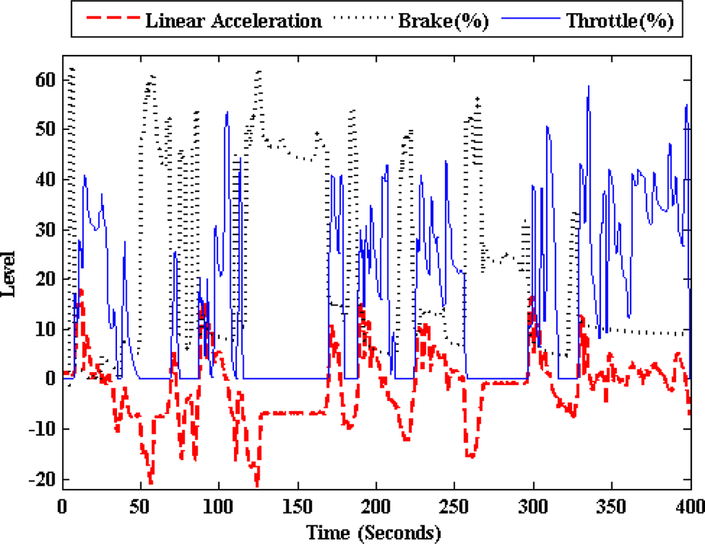 Observable and measurable driving signals can be divided into three categories []: (1) driving activity signals, e.g., throttle, clutch and brake pedal activities or pressures and steering wheel angles; (2) vehicle state signals, e.g., vehicle speed and acceleration, regime engine; and (3) vehicle position signals, e.g., following distance, relative lane position, and relative angles (pitch and roll).