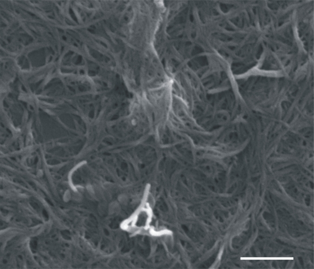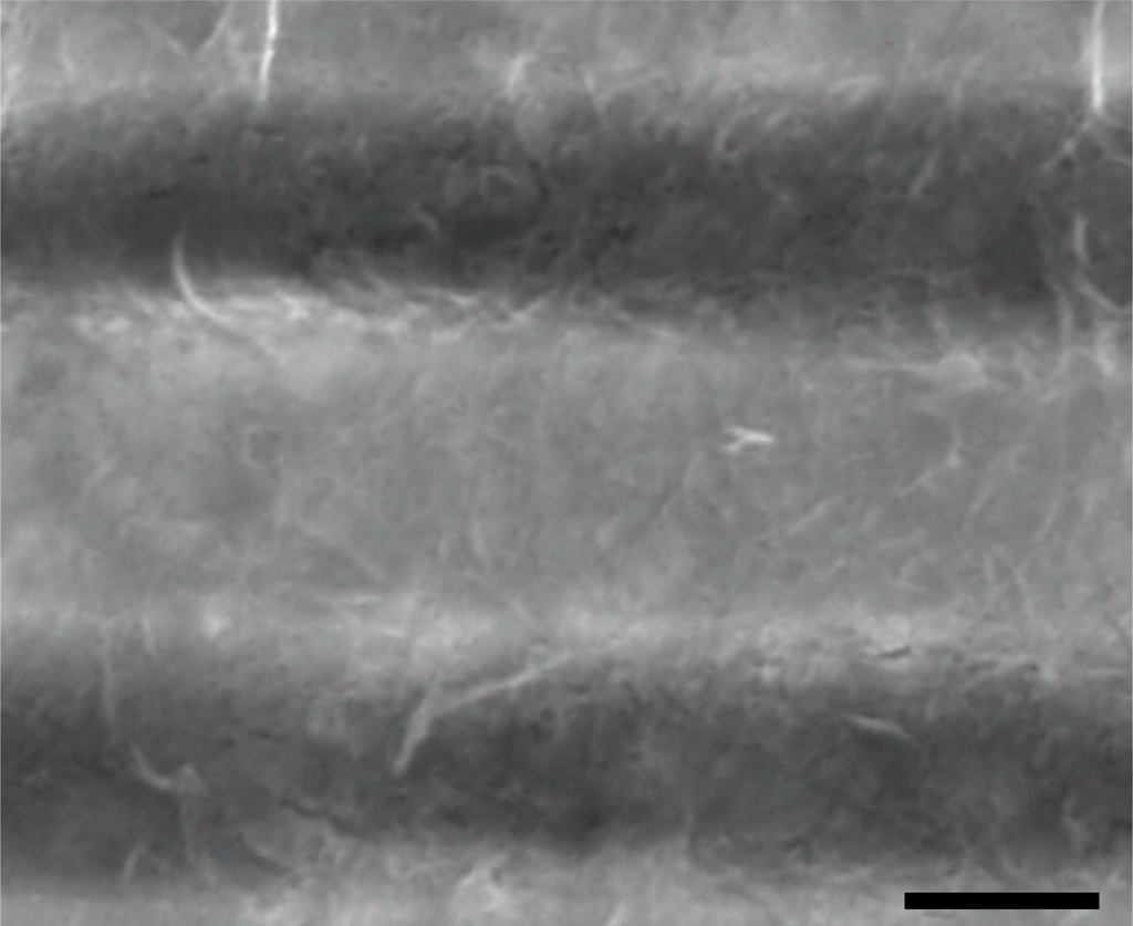 SEM micrography of SWCNTs deposited between electrodes. Scale bar: 1 μm.