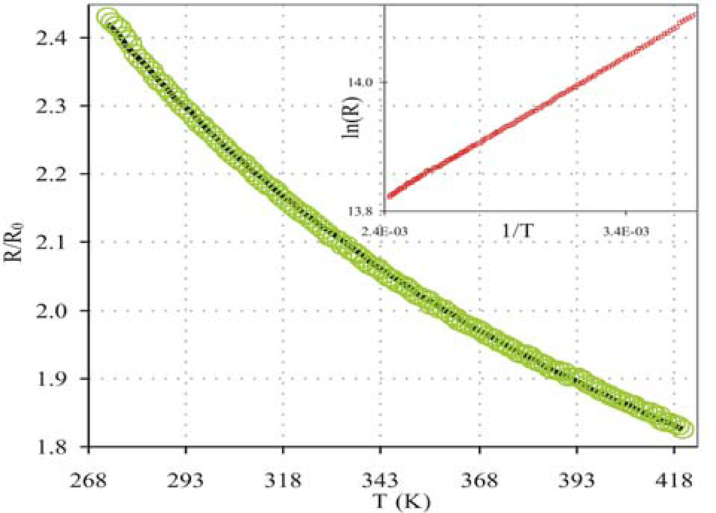 Resistance vs. temperature for SWCNTs deposited on electrodes connected to the amplifier. Line is fit to the data obtained from Equation (1) with fit parameters: T1 = 277 K and T0 = 40 K. The inset shows the data in a Ln(R) vs. 1/T plot.
