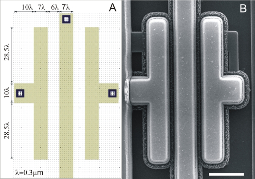 (A) Mask layout with electrode dimensions, (B) SEM micrography of the electrodes. The gap between the electrodes is 1.3 μm. Scale bar: 10 μm.