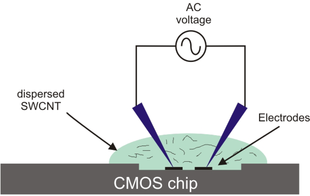 To place the SWCNTs on the electrodes, a dielectrophoretic (DEP) process is used to improve the efficiency of SWCNT sensor fabrication. DEP is a phenomenon where neutral particles undergo mechanical motion inside an AC electric field [9,10]. The DEP force is a simple and effective methodology to assemble SWCNTs on electrodes and is compatible with commercial CMOS process [11].