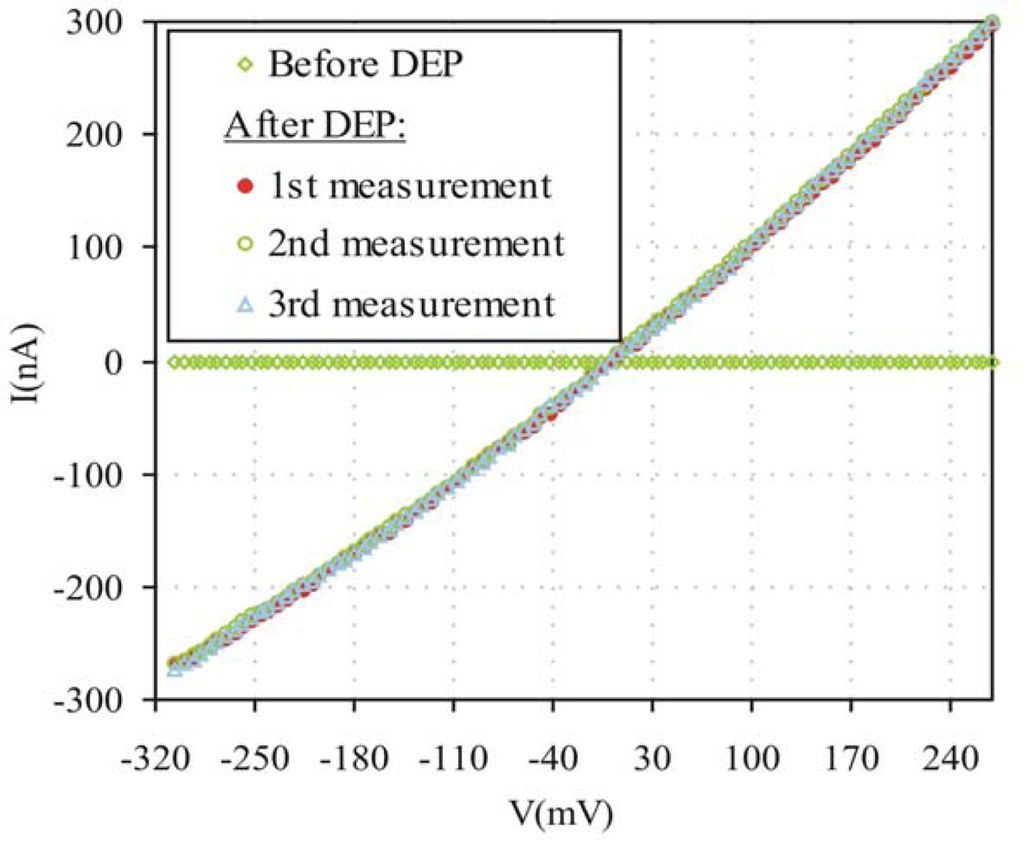 Current voltage characteristics of the SWCNTs assembled onto CMOS circuitry by DEP process.