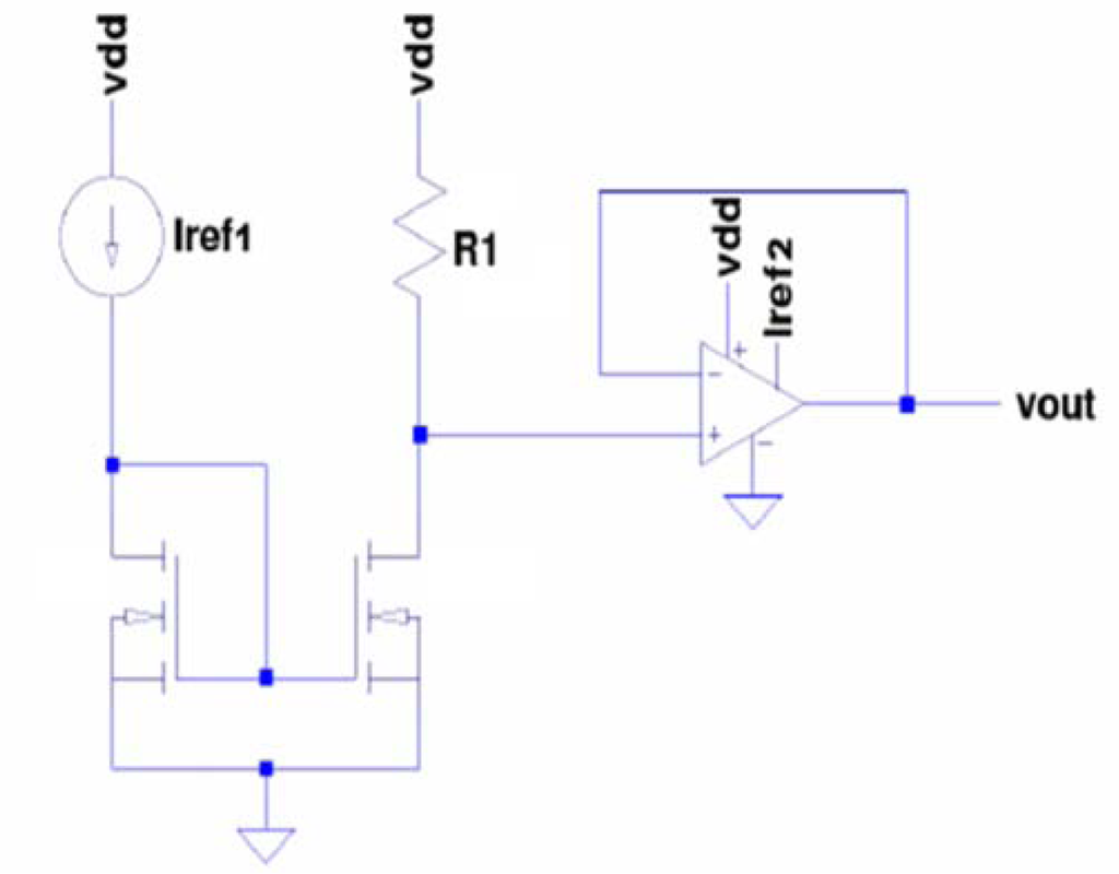 Schematic of the amplifier. Vdd: 5V, current reference 1 (Iref1): 2 μA, current reference 2 (Iref2): 10 μA, R1: SWCNT resistance; Vout: output voltage.
