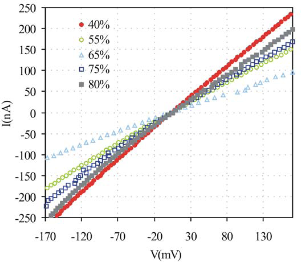 We examined the effect of the humidity changes on the resistance of SWCNTs. Figure 8 shows the effect of humidity over the current voltage characteristics of SWCNTs placed on the free electrodes. Under a modest humidity, the adsorbed water molecules appear to compensate the hole carriers in the SWCNTs, resulting in a increase in the resistance. When the humidity level becomes higher than 67%, the decreasing resistance is probably due to a surplus electron carrier. The possible influence of a contact resistance between electrodes and SWCNTs was recently addressed by other authors [17–19] and ruled out because the contact resistance present in two leads contacted samples provide a comparatively low contact resistance relative to the resistance between the electrodes and the possible Schottky barriers formed at the SWCNTs-electrode interface have a negligible effect on the measurements.
