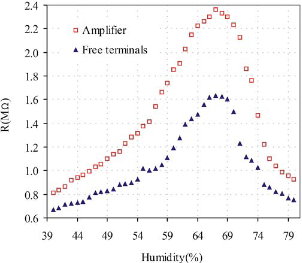 A difference (approx. 0.2–0.8 Mohm) between the resistance with the amplifier and the free electrodes was observed with a same humidity value. This difference can be attributed to a different amount of SWCNTs deposited between each electrode.