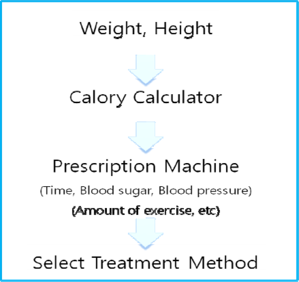 The program selects the smallest number and compares the treatment method of the sample data and the treatment method corresponding to the data. The small scale data that is used consists of the KNN classifier and the time, blood sugar, systolic blood pressure, diastolic blood pressure, amount of exercise, amount of meals, and target consumption calories. It is used because it is the simplest machine learning algorithm, and is able to classify data without any human expert assistance.