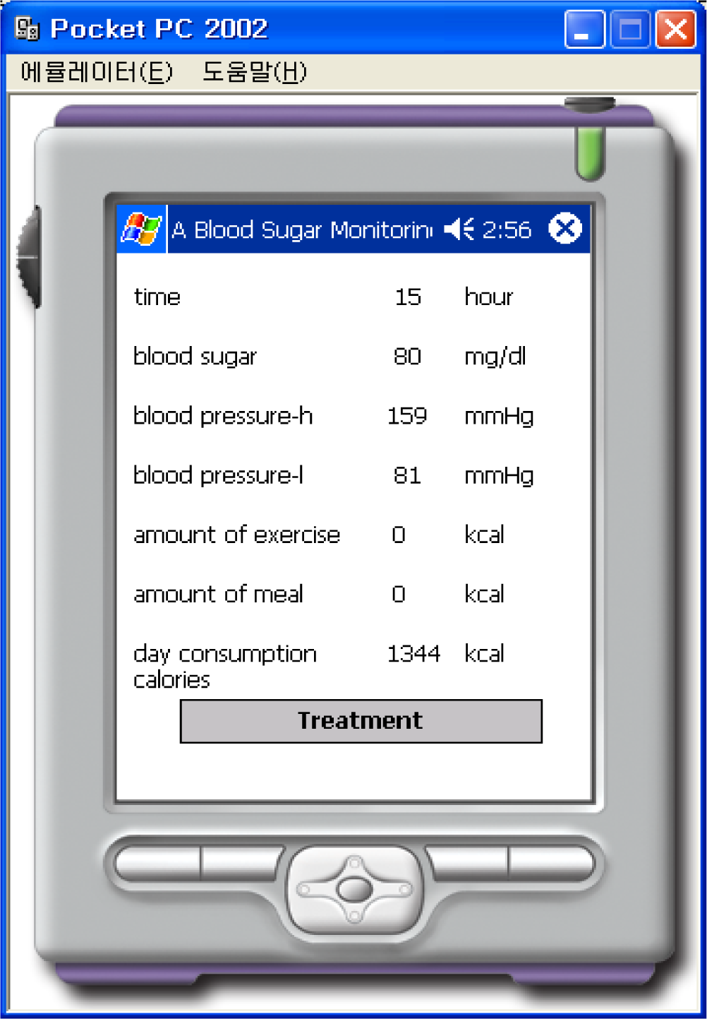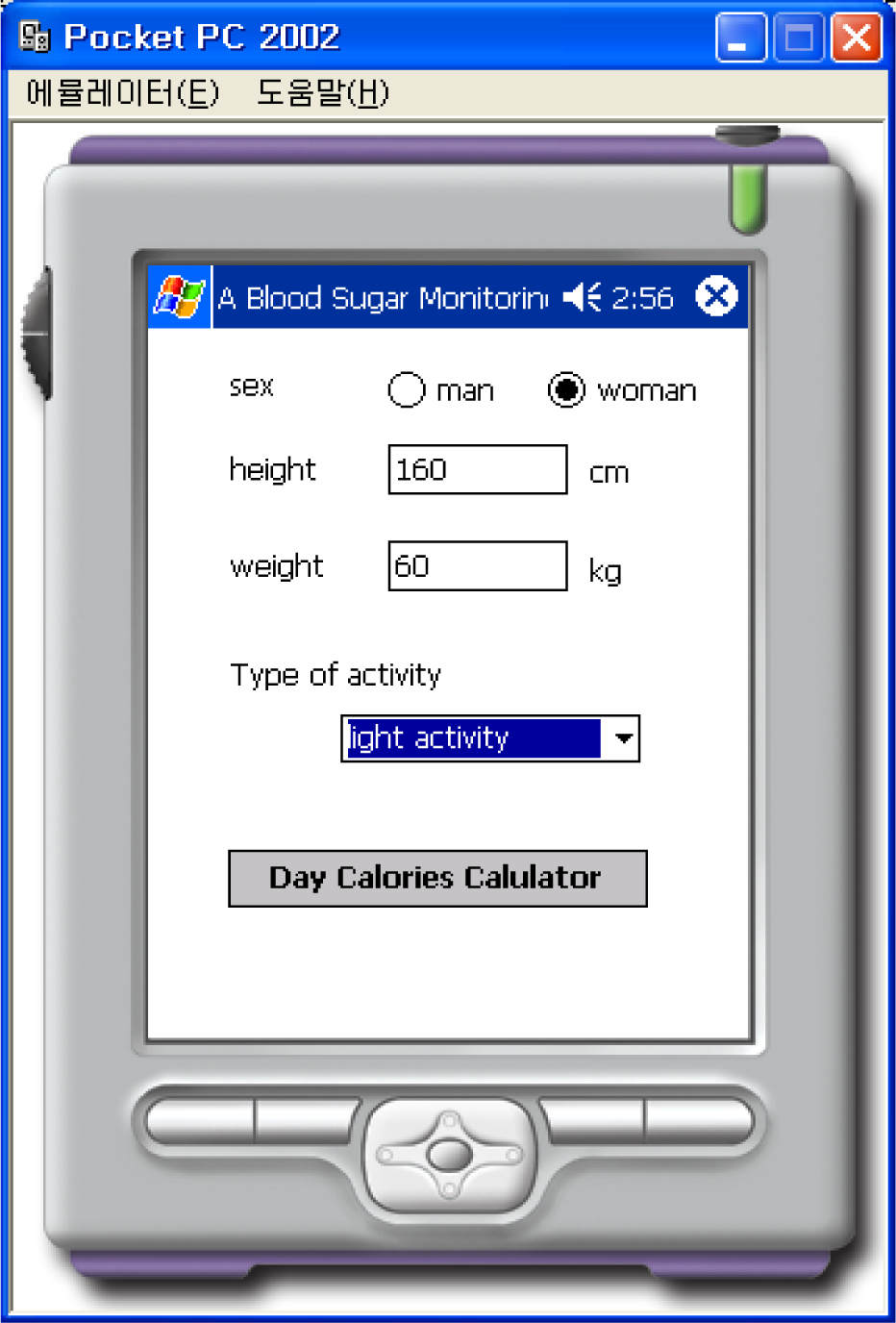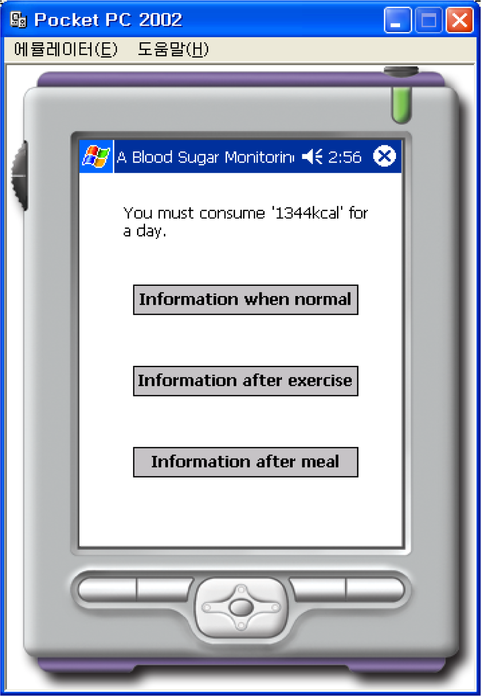 This “BloodSugarService” Web Service uses the web-reference in order to do the PDA programming. Information such as the sex, height, weight, and types of activities are input, as shown in Figure 8 in order to calculate the number of calories that must be consumed per day. The calculation is performed by connecting to the “BloodSugarService” Web Service, and information about the number of calories that must be consumed per day is displayed on the PDA. As shown in Figure 9 there are three buttons labeled normal, after exercise, and after a meal. The information about time, blood sugar, systolic blood pressure, diastolic blood pressure, amount of exercise, amount of meals, calories consumed per day, etc., may be retrieved from the file and displayed on the screen, as shown in Figure 10, when the patient presses the appropriate button.