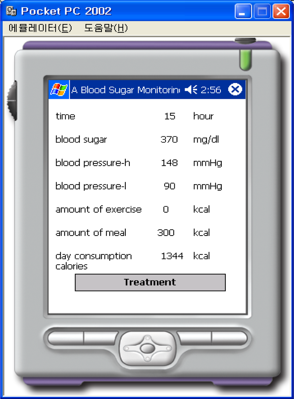 This Section introduces the data used in the experiment and compares the rule based method with the method that uses the KNN classifier to select the most appropriate treatment method. Also, it describes the implementation of a blood sugar monitoring system designed to select the best treatment method through the process of comparison and using the patient’s PDA. To implement the proposed system, a mobile RFID module is designed and developed. A Wireless Internet Platform for Interoperability (WIPI) interface is developed as an emulator application for the mobile environment in JAVA using a Pico pass/Pico RFID tag and a HAND' IT-2G RFID reader. Table 4 shows a portion of the sample data and the test data. Time has values ranging from 0 to 24, the blood sugar and blood pressure are measured data. The units for exercise, amount of meals and target caloric consumption is in kcal. The amount of exercise is the number calories consumed after exercise, the amount of meals is the number of calories consumed after a meal, and the target caloric consumption is the total number of calories that the patient must consume per day. The treatment is one of the five methods of treatment as listed in Table 5.